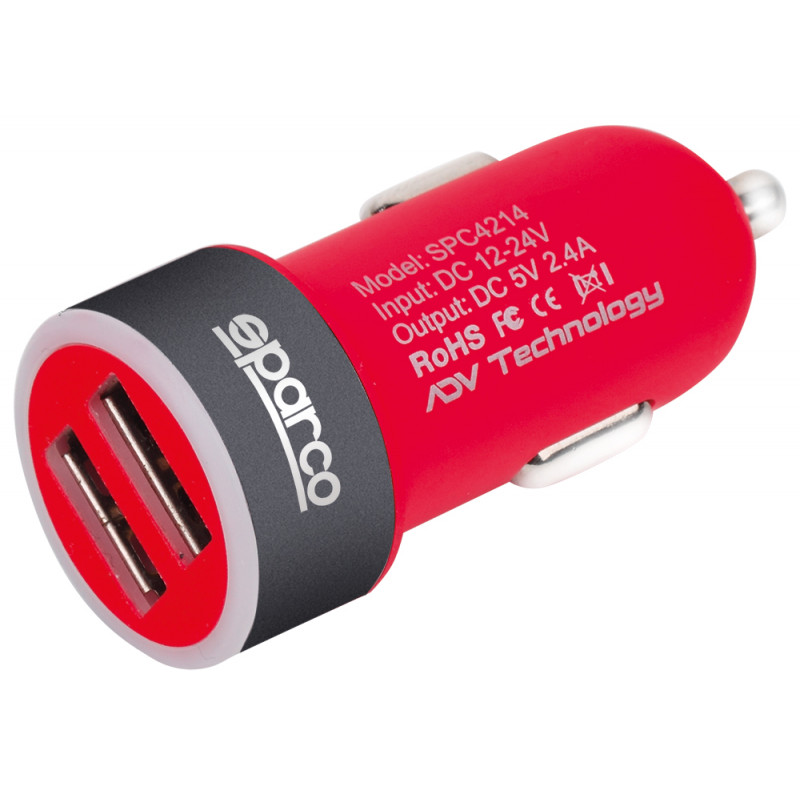 Caricabatterie da auto con doppia uscita USB. Input: 12/24V DC. Output: 5V 2.4A.