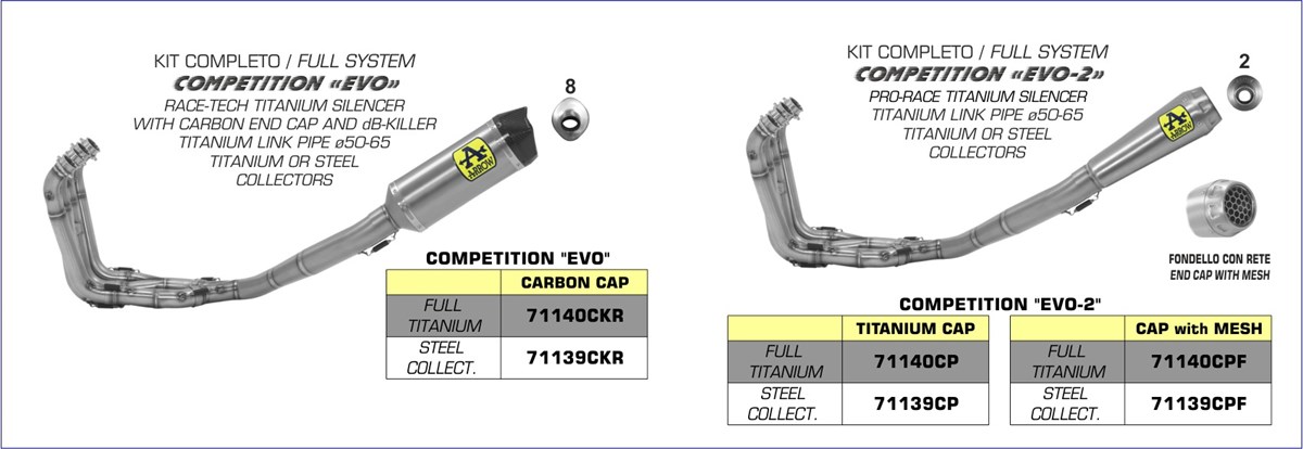 La linea Competition, progettata dall'R&D Arrow sulla base delle esperienze in pista, nata specificatamente per moto elaborate per la partecipazione a competizioni su circuito e sono simili agli scarichi che vengono forniti ai top team SBK e SS. Gli scarichi Competition sono realizzati con la massima cura dei dettagli e assicurano la miglior erogazione possibile dei potenti motori preparati per le gare: diametri maggiorati in alcuni punti, profili differenti per le variazioni di sezione, accoppiamenti accurati, terminali di scarico speciali, ricerca dei materiali. Completamente assemblati con processo manuale di saldatura a TIG, gli scarichi della linea Competition sono disponibili nella versione 'full titanium' o nella versione terminale in titanio e collettori in acciaio inox. In tutti i casi i kit collettori sono equipaggiati con l?attacco per la sonda CO, per verificare e correggere i settaggi della centralina al variare delle condizioni e delle necessit del pilota. Il design del silenziatore, Arrow style, molto curato e, oltre a garantire le massime prestazioni , consente di contenere il rumore all?interno dei limiti imposti dai regolamenti di gara. E' disponibile anche la versione con fondello posteriore in carbonio. A seguito delle limitazioni sulla rumorosit delle attivit in pista, e dei conseguenti controlli che vengono effettuati nei circuiti, sono disponibili anche le versioni con dB-killer estraibile. Lo scarico Competition lo stato dell'arte in fatto di stile, tecnologia e performance dei prodotti Arrow.