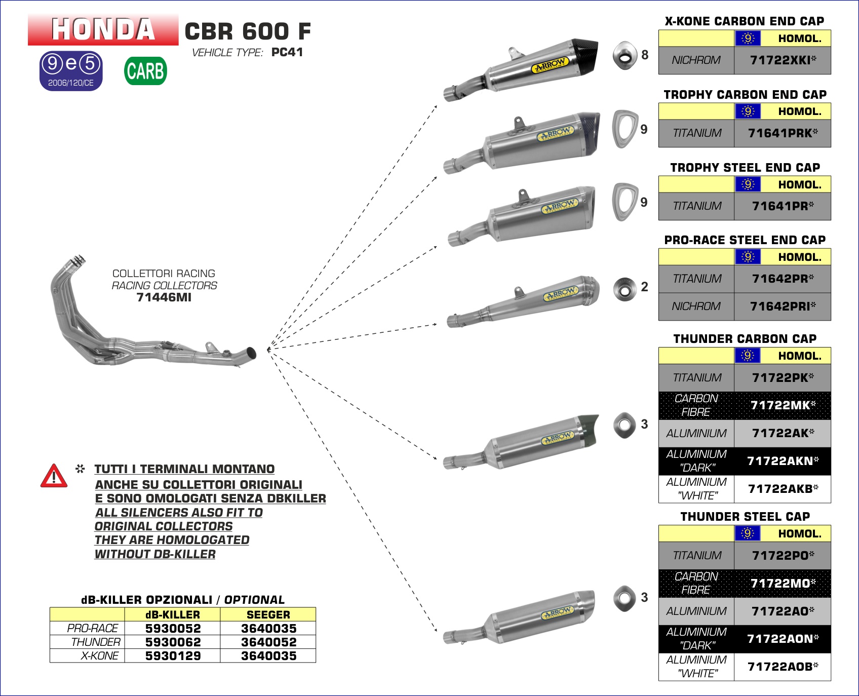 Sempre più spesso i nuovi modelli di moto sono equipaggiati dalle case madri con terminali di scarico molto piccoli e sopratutto installati in posizioni particolari: questo rende necessario, anche per i prodotti after market, lutilizzo di terminali sempre più compatti. Arrow ha perciò deciso di introdurre anche nel settore delle moto stradali una forma, inizialmente sviluppata per gli scarichi off-road, a sezione romboidale, compatta e versatile. E quindi nata la linea Street Thunder, fusione di tecnica e design, sicuramente tra gli scarichi più belli ed apprezzati sul mercato. Sono disponibili con corpo in titanio, alluminio o fibra di carbonio mentre il fondello posteriore, dal design completamente rinnovato, è disponibile in acciaio inox o in fibra di carbonio. Per compensare la riduzione del volume disponibile, è stato necessario un importante lavoro di ricerca sui materiali fonoassorbenti e innumerevoli prove in pista e nel reparto R&D fino ad arrivare a definire le tecnologie e materiali migliori da utilizzare. I terminali Street Thunder, installabili nelle versioni slip-on e kit completo con collettori Arrow, sono leggeri e performanti. Sono terminali omologati, salvo eccezioni verificabili nel singolo montaggio, con dB-Killer estraibile.