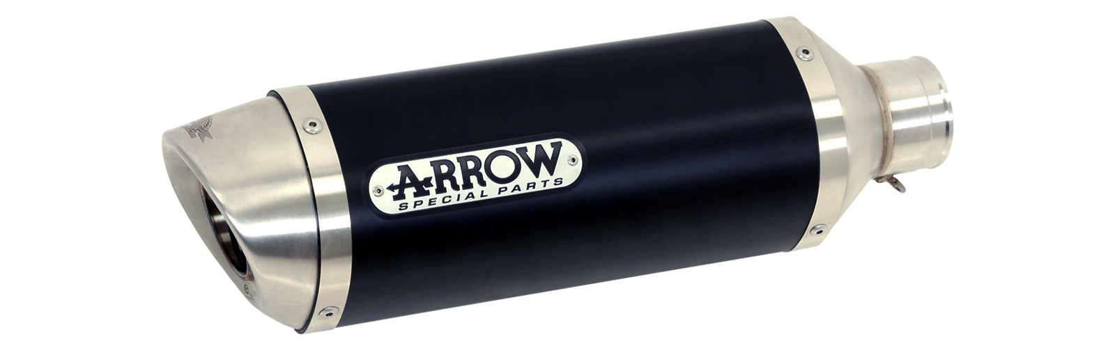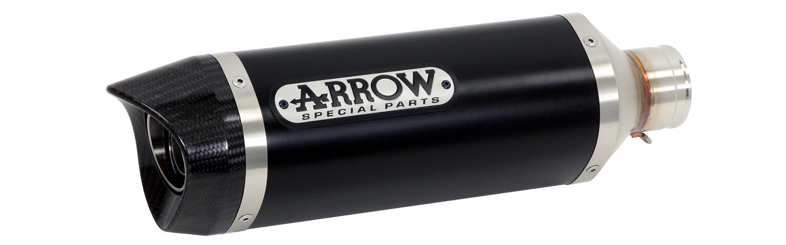 Sempre più spesso i nuovi modelli di moto sono equipaggiati dalle case madri con terminali di scarico molto piccoli e sopratutto installati in posizioni particolari: questo rende necessario, anche per i prodotti after market, lutilizzo di terminali sempre più compatti. Arrow ha perciò deciso di introdurre anche nel settore delle moto stradali una forma, inizialmente sviluppata per gli scarichi off-road, a sezione romboidale, compatta e versatile. E quindi nata la linea Street Thunder, fusione di tecnica e design, sicuramente tra gli scarichi più belli ed apprezzati sul mercato. Sono disponibili con corpo in titanio, alluminio o fibra di carbonio mentre il fondello posteriore, dal design completamente rinnovato, è disponibile in acciaio inox o in fibra di carbonio. Per compensare la riduzione del volume disponibile, è stato necessario un importante lavoro di ricerca sui materiali fonoassorbenti e innumerevoli prove in pista e nel reparto R&D fino ad arrivare a definire le tecnologie e materiali migliori da utilizzare. I terminali Street Thunder, installabili nelle versioni slip-on e kit completo con collettori Arrow, sono leggeri e performanti. Sono terminali omologati, salvo eccezioni verificabili nel singolo montaggio, con dB-Killer estraibile.