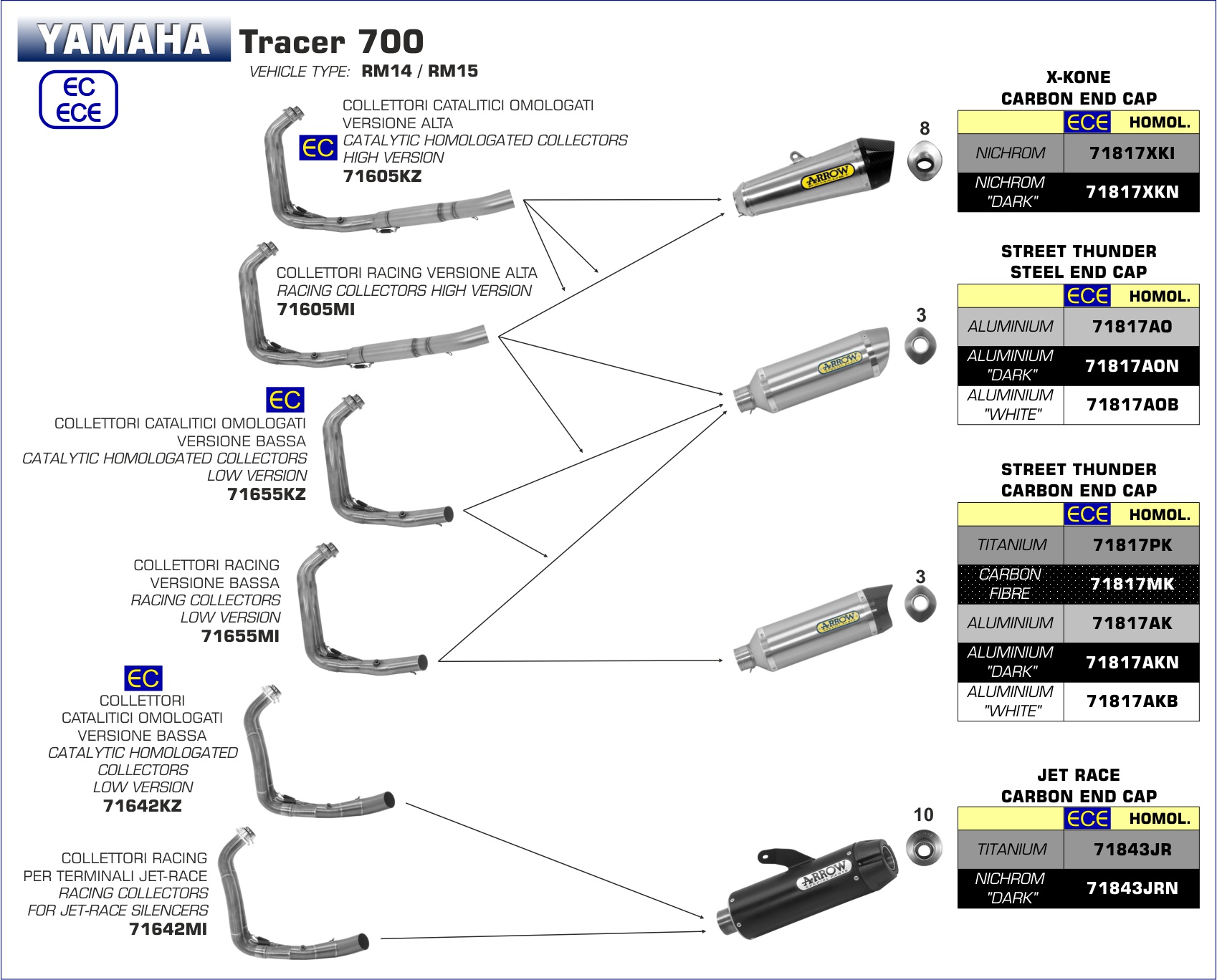 Sempre più spesso i nuovi modelli di moto sono equipaggiati dalle case madri con terminali di scarico molto piccoli e sopratutto installati in posizioni particolari: questo rende necessario, anche per i prodotti after market, lutilizzo di terminali sempre più compatti. Arrow ha perciò deciso di introdurre anche nel settore delle moto stradali una forma, inizialmente sviluppata per gli scarichi off-road, a sezione romboidale, compatta e versatile. E quindi nata la linea Street Thunder, fusione di tecnica e design, sicuramente tra gli scarichi più belli ed apprezzati sul mercato. Sono disponibili con corpo in titanio, alluminio o fibra di carbonio mentre il fondello posteriore, dal design completamente rinnovato, è disponibile in acciaio inox o in fibra di carbonio. Per compensare la riduzione del volume disponibile, è stato necessario un importante lavoro di ricerca sui materiali fonoassorbenti e innumerevoli prove in pista e nel reparto R&D fino ad arrivare a definire le tecnologie e materiali migliori da utilizzare. I terminali Street Thunder, installabili nelle versioni slip-on e kit completo con collettori Arrow, sono leggeri e performanti. Sono terminali omologati, salvo eccezioni verificabili nel singolo montaggio, con dB-Killer estraibile.
