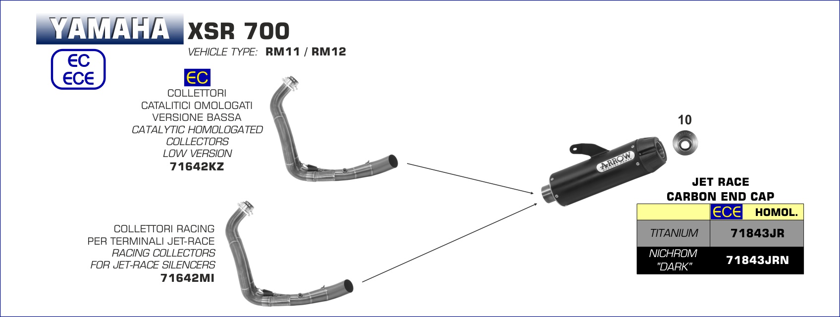 L'ultima creazione Arrow si chiama Jet-Race e nasce dall'idea di realizzare uno scarico performante, caratterizzato da una immediata riconoscibilit stilistica, da forte personalit e costruito con i migliori materiali disponibili. Il corpo in titanio ed il fondello in fibra di carbonio con un design realizzato ad-hoc. Caratteristiche che, unite all'alto contenuto progettuale e tecnologico delle lavorazioni, ne fanno un oggetto unico nel panorama degli scarichi motociclistici.