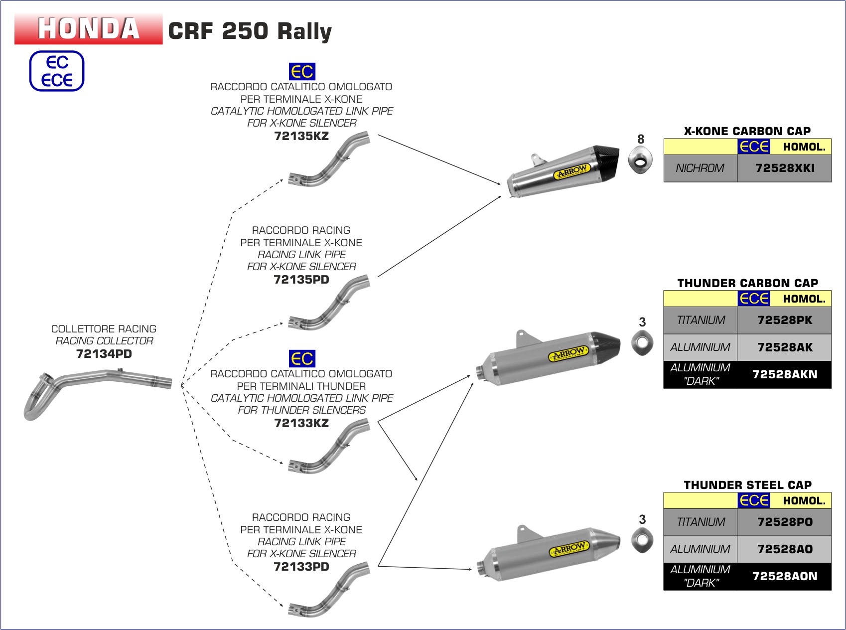 L?evoluzione delle moto off-road, diventate sempre pi potenti, leggere, compatte e rigide ha spinto Arrow allo sviluppo di una linea dedicata di scarichi dedicata al segmento, disegnata tenendo conto delle nuove e particolari esigenze dei piloti off-road. Le caratteristiche di leggerezza, affidabilit e prestazioni, da sempre vanto degli scarichi Arrow sono arricchite, nella linea Off-Road Thunder, dall?esperienza maturata in anni di sviluppo, e vittorie, sulle piste mondiali di motocross ed enduro. La forma romboidale, vero e proprio marchio di fabbrica di Arrow, assicura un ottimo compromesso tra dimensioni interne ed ingombri esterni e si raccorda direttamente al profilo del fondello posteriore, disegnato per rispettare i requisiti imposti dai regolamenti di gara. L'Off-Road Thunder disponibile nelle versioni slip-on o kit completo di collettore Arrow ed di semplice installazione. Il corpo esterno del silenziatore in titanio o alluminio, estremamente leggero e le sue performance ne fanno un top di gamma.