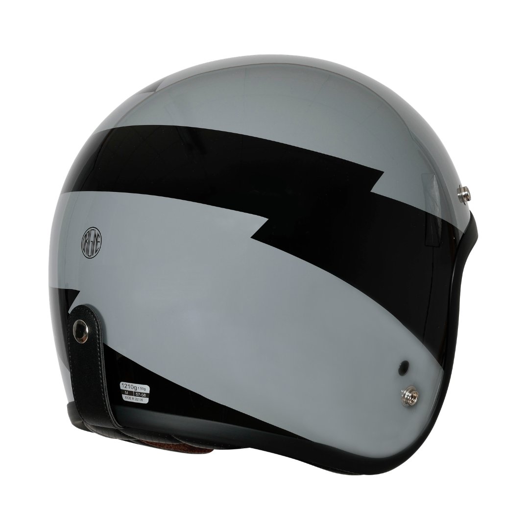 Eleva il tuo stile urbano con questo casco jet dal design vintage, perfetto per chi guida custom, café racer o scooter classici. Caratterizzato da una raffinata calotta grigio lucido (stile Nardò Grey) con un’aggressiva grafica a raggi e fulmini neri, questo casco combina un’estetica d'altri tempi con la sicurezza delle tecnologie attuali.