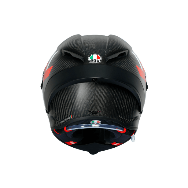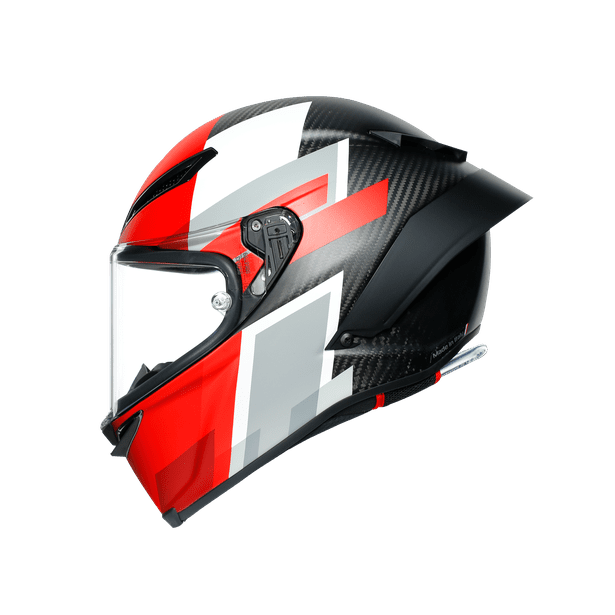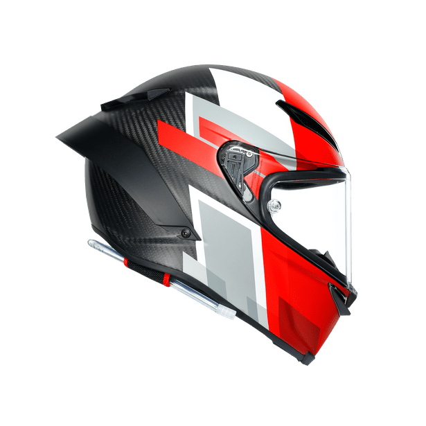 Pista GP RR è la perfetta replica del casco AGV utilizzato in gara dai campioni del motomondiale. Per questo ha ricevuto la nuova omologazione FIM, che certifica il più alto livello di protezione possibile, anche dalle pericolose accelerazioni rotazionali della testa. Ogni dettaglio è pensato per la performance assoluta. La calotta in Extreme Carbon 100% fibra di carbonio garantisce una leggerezza estrema, per non sentire mai la fatica di indossarlo. Le sue forme e le prese d’aria in metallo sono studiate in galleria del vento e testate dagli atleti AGV per avere la migliore penetrazione aerodinamica e la massima stabilità alle alte velocità, anche grazie all’innovativo profilo del PRO Spoiler posteriore. La visiera Ultravision di classe ottica 1 è parte integrante della protezione grazie ad uno spessore di fino a 5mm e consente una visione panoramica di 190°. Significa vedere la pista, gli avversari e gli ostacoli più nitidamente, prima di chiunque altro. L’esclusivo sistema 360° Adaptive Fit permette di personalizzare completamente gli interni, dando la possibilità di scegliere lo spessore ideale sulla parte superiore della testa, la nuca e le guance. Un comfort fondamentale per correre in libertà e pensare solo alla traiettoria.