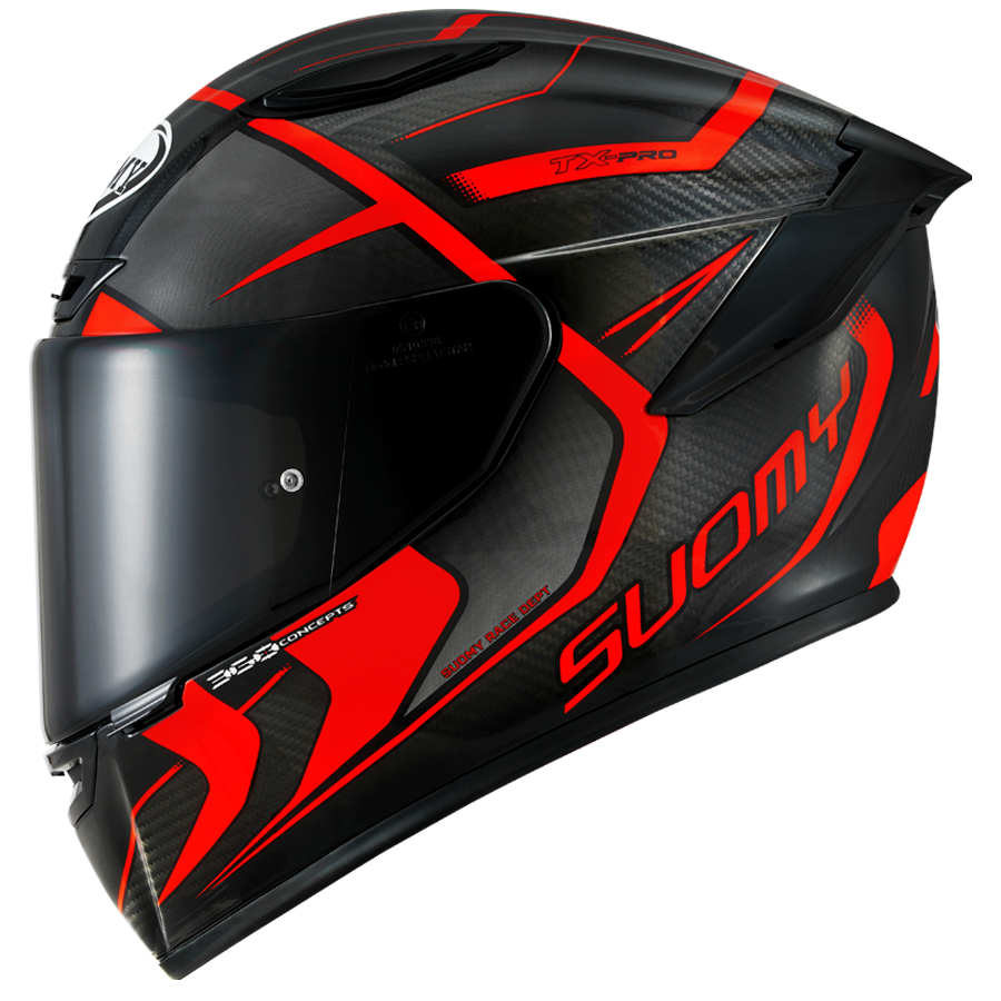 Casco Suomy TX-Pro . Il TX-Pro è il nuovo casco sportivo integrale di Suomy derivato dalla competizione. Realizzata in Tricarboco, la sua forma è stata ottimizzata e progettata per una guida sportiva. Ha un efficiente sistema di ventilazione, imbottitura interna hydrocool e uno spoiler posteriore aerodinamico. È omologato secondo la nuova normativa ECE 22.06.
