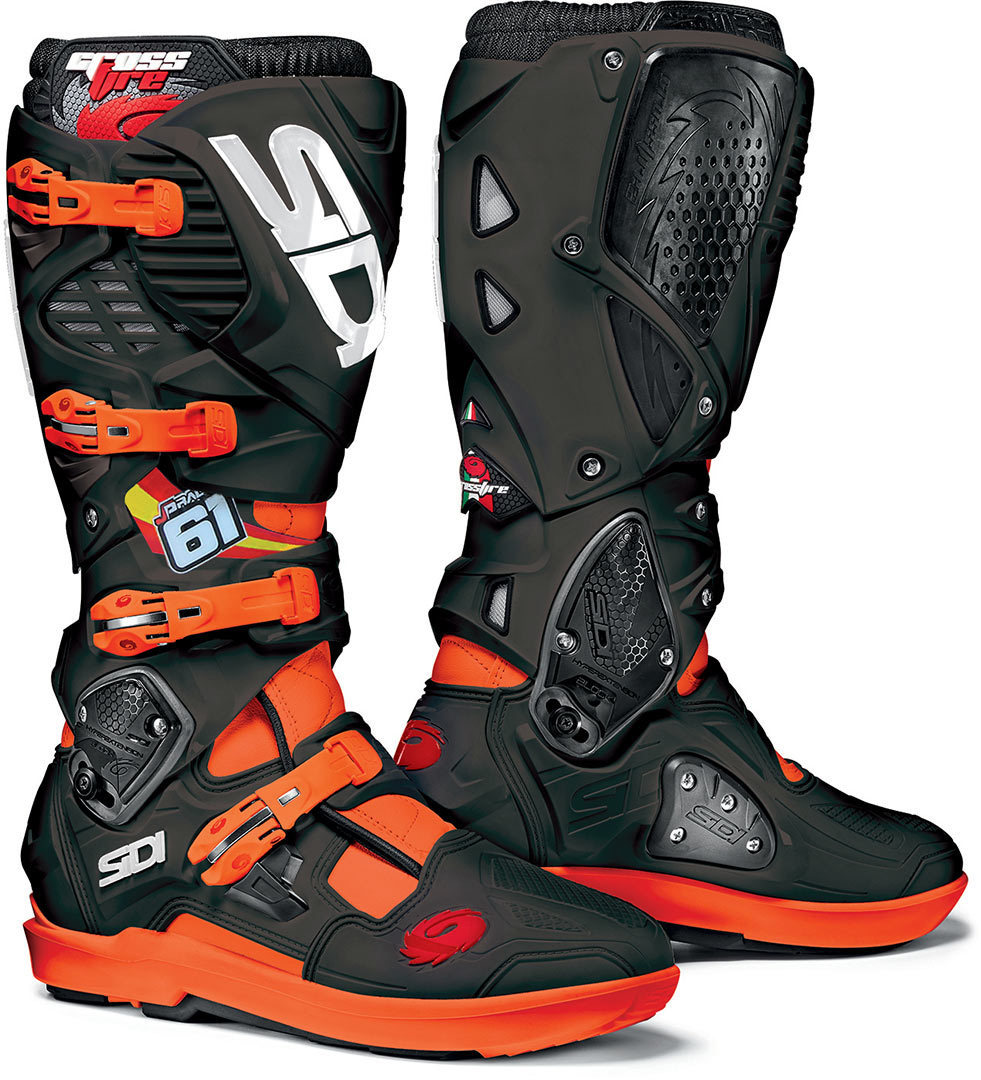 I Crossfire 3 di Sidi sono stivali cross realizzati nella speciale microfibra Technomicro. Il Technomicro consiste in una fibra composita creata da fili più sottili della seta, che agiscono come la Pelle naturale ma con il vantaggio di una migliore resistenza, una maggiore morbidezza e leggerezza. Inoltre questa speciale fibra è resistente all’acqua ed altamente resistente all’abrasione e alla lacerazione, questo assicura grandi prestazioni di utilizzo. Estremamente comodi e protettivi, i Crossfire 3 dispongono di uno snodo sulla caviglia che previene l’iper estensione del collo del piede, del tendine e della caviglia durante la flessione della gamba in avanti o indietro, per un maggiore sicurezza e confort al pilota. Numerose disposizione tecniche dello stivale come la suola in gomma, chiusura micrometrica a 4 leve, gambale regolabile, puntale rinforzato e tallone rigido resistente agli urti anatomico e sagomato.
