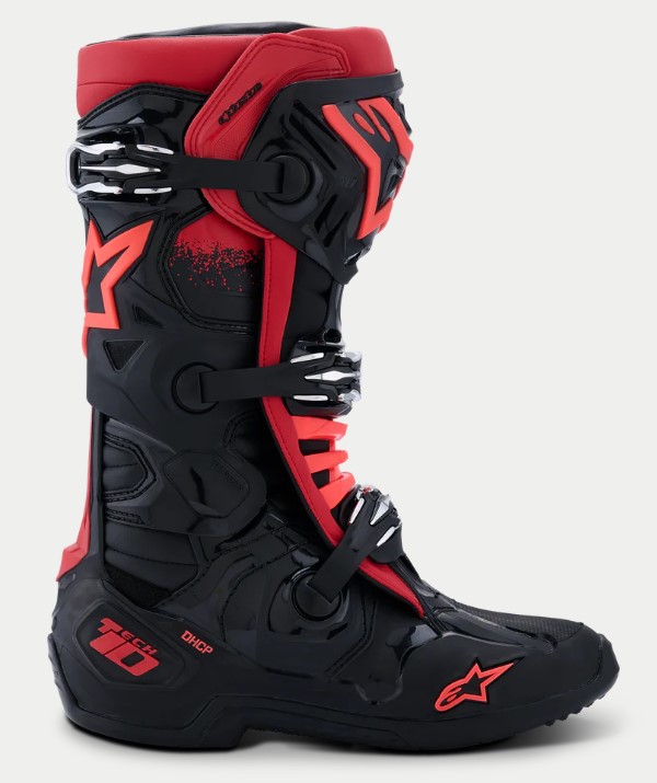 - Integrato nel telaio del piede monopezzo unico e leggero del Tech 10 c'è il Dynamic Heel Compression Protector (DHCP) brevettato, una caratteristica di sicurezza innovativa che include un'area del tallone completamente integrata e collassabile con schiuma poliuretanica espansa per assorbire le energie d'impatto elevate durante un incidente. Il DCHP presenta un sistema di protezione dagli impatti direzionale che riduce significativamente l'effetto dell'energia eccessiva, potenzialmente causa di infortuni, trasferita alla caviglia e alla parte inferiore della gamba. Il DHCP è stato utilizzato dagli atleti di Alpinestars negli ambienti impegnativi del Supercross e Motocross professionale.